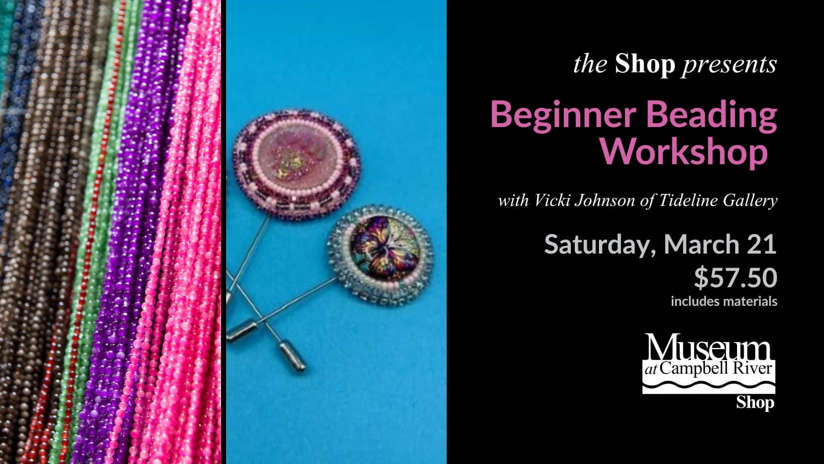 Join the talented mother-and-daughter team of Tideline Gallery for a hands-on introduction to beadwork at the Museum at Campbell River. Artist Vicki Johnson, skilled in intricate beadwork, will guide participants in making a Flat Stitched Beaded Pin.